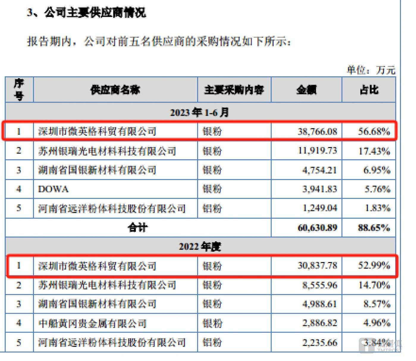 另外,在供应商方面,天盛股份也较为依赖深圳市微英格科贸有限公司 (下称 「微英格」)。招股说明书显示,2022 年和 2023 年 1-6 月,天盛股份向微英格采购的金额分别为 30837.78 万元、38766.08 万元,分别占当期采购总额的 52.99%、56.68%。