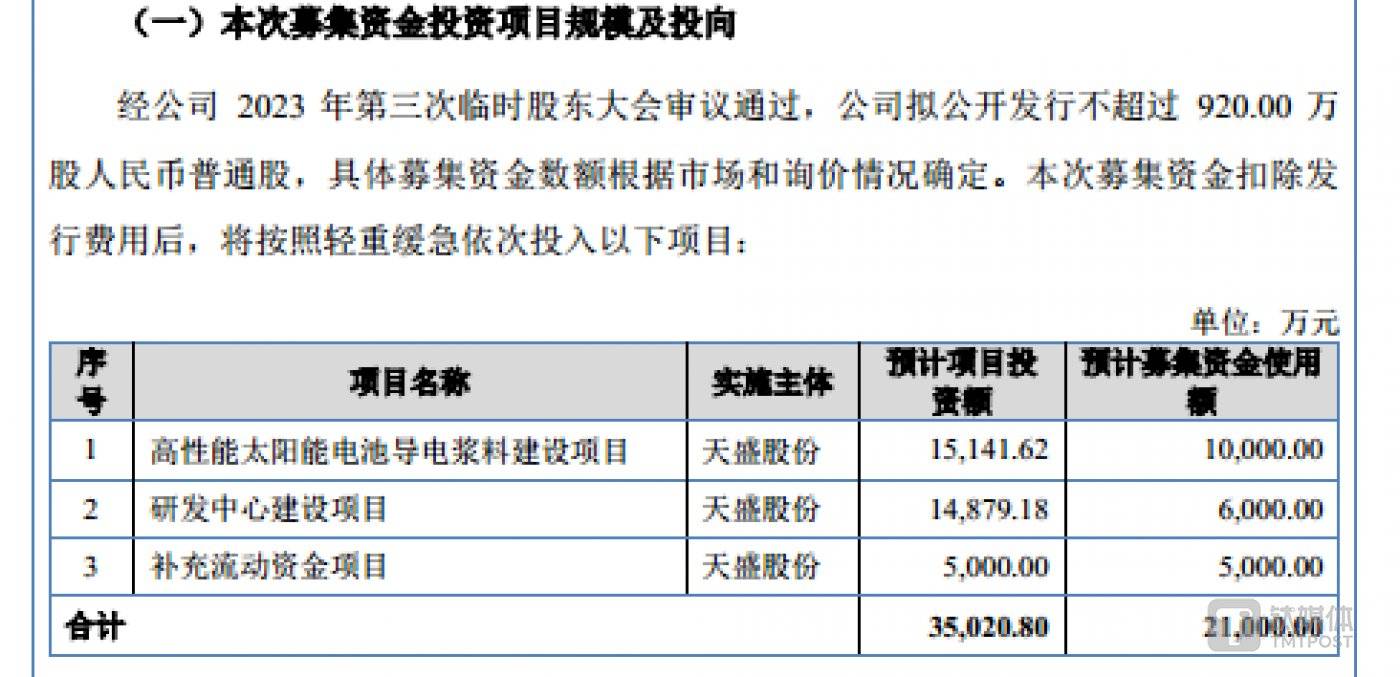 事实上,就算天盛股份融资成功,募投项目能否持续进行还要值得商榷。天盛股份此次北交所 IPO 欲募集 2.1 亿元分别用于高性能太阳能电池导电浆材料建设项目、研发中心建设项目、补充流动资金项目,具体情况如下:
