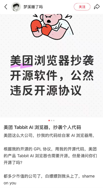 同时,独立开发者 「梦溪睡了吗」 也就此事发布声明:「在问题被指出后,Tabbit 团队第一时间与我取得联系,并对项目使用情况进行了说明与内部自查。从沟通过程来看,对方态度积极、处理及时,可以确认本次问题并非出于主观恶意,而是对开源协议理解和合规流程不够严谨所致。