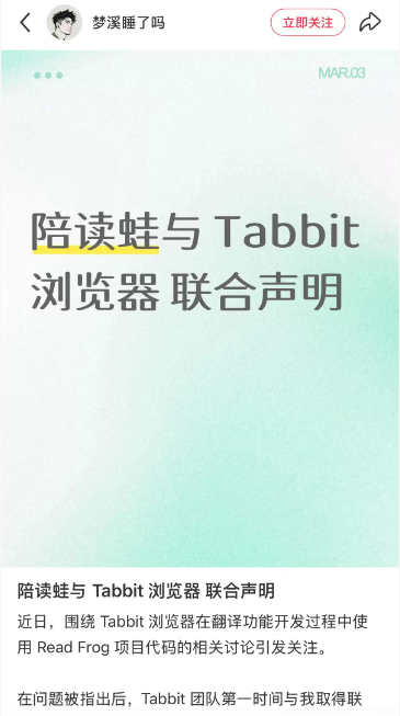 Tabbit 团队迅速自查并发布声明,承认使用并修改了开源项目 readfrog 的代码。过程中对于该项目的开源协议调研不够充分,对开源社区规范造成了不好的影响。我们虚心改正,并第一时间将自己修改的项目代码进行了完整开源。