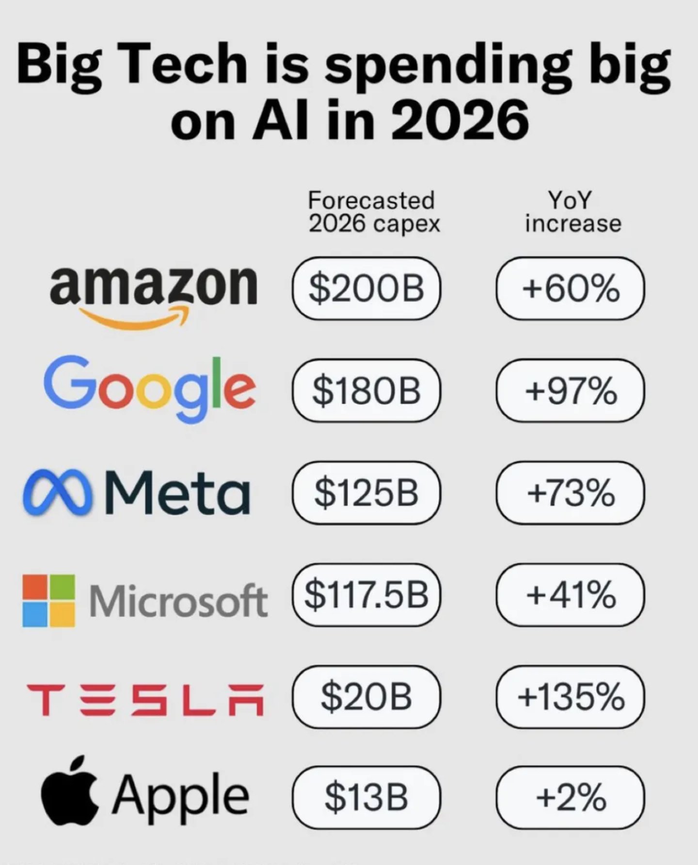 毕竟,购买英伟达显卡的巨头们,正在承受着史无前例的现金流失血。在刚刚过去的财报季中,华尔街投行们算出了一笔账:谷歌、微软、亚马逊和 Meta 四家巨头,预计 2026 全年的资本支出 (CapEx) 总额将突破令人咋舌的 6500 亿美元。仅仅为了维持这场游戏不下牌桌,巨头们必须烧掉相当于好几个超级独角兽市值的真金白银去购买芯片、建设数据中心乃至配套电厂。