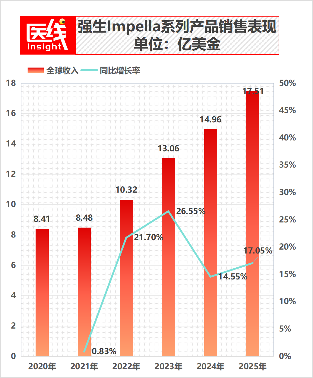 问询函透露了一组数字:仅 2025 年,Impella 系列的全球销售额就高达 17.51 亿美元,且复合增速超 15%,是强生医疗板块当之无愧的“ 现金牛”。