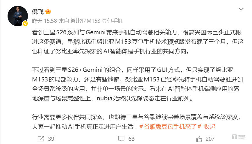 努比亚总裁倪飞指出,“ 三星 S26+Gemini 的组合,同样采用了 GUI 方式,但只实现了努比亚 M153 的局部能力,还是有些遗憾。努比亚 M153 已经率先将手机自动驾驶推进到全场景系统级的应用,并非单一场景的演示。行业需要更多伙伴共同探索,也期待三星与谷歌继续完善场景覆盖与系统级深度,大家一起推动 AI 手机真正走进用户生活。”