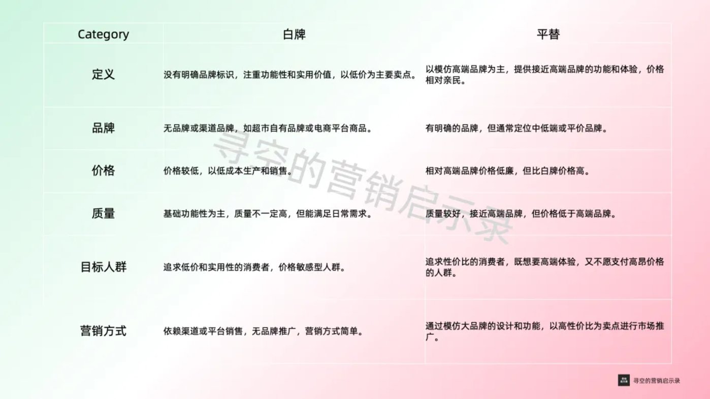 在消费降级的趋势下,白牌和平替商品逐渐受到越来越多消费者的青睐,市场规模不断扩大。这背后反映的是人们在价格、实用性和品牌附加值之间的权衡。品牌的概念我们都比较熟悉,不必多说,这里主要说白牌和平替。