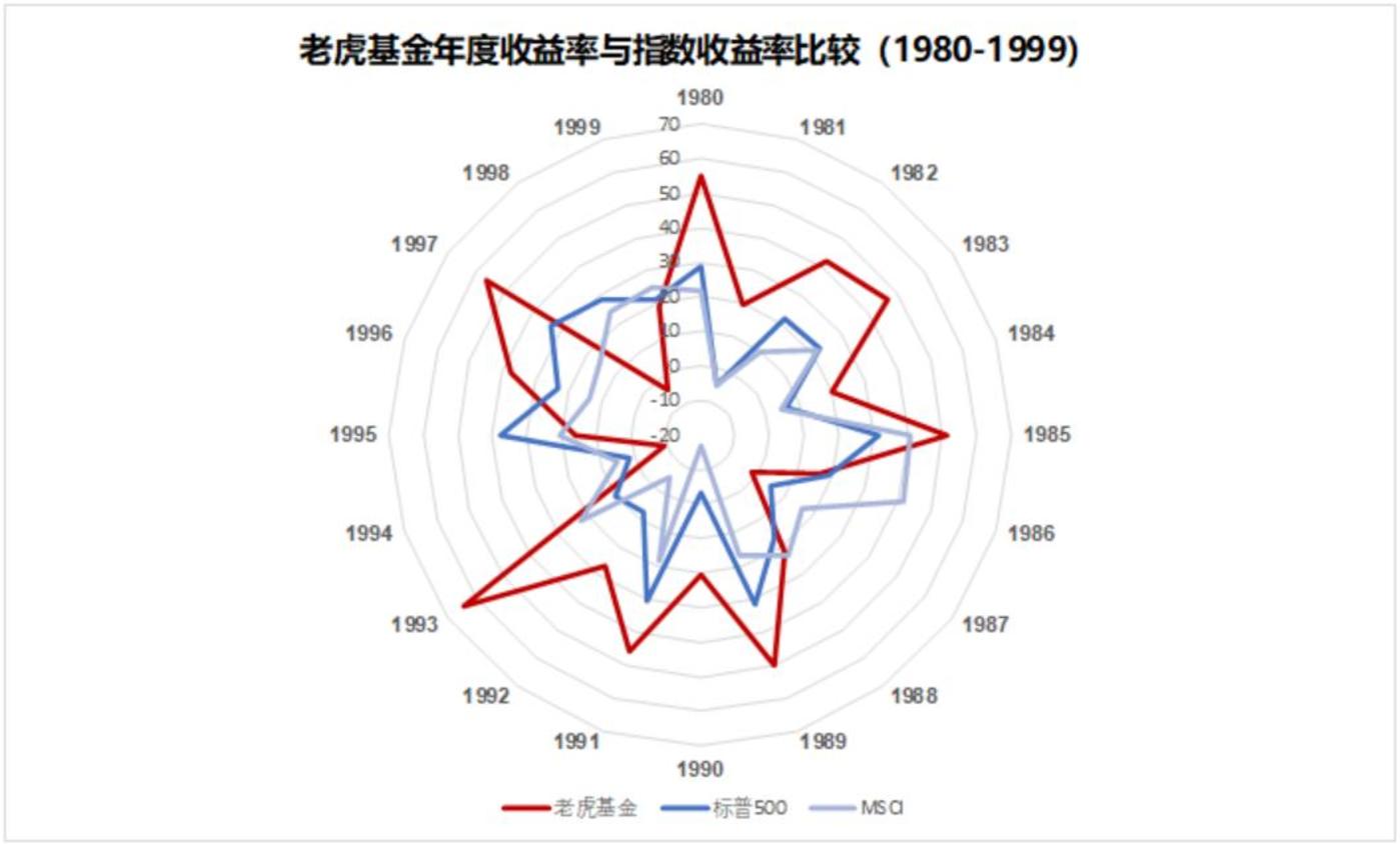 老虎基金在他成立之后,大部分的年份里都跑赢了标普 500 和 MSCI 指数。
