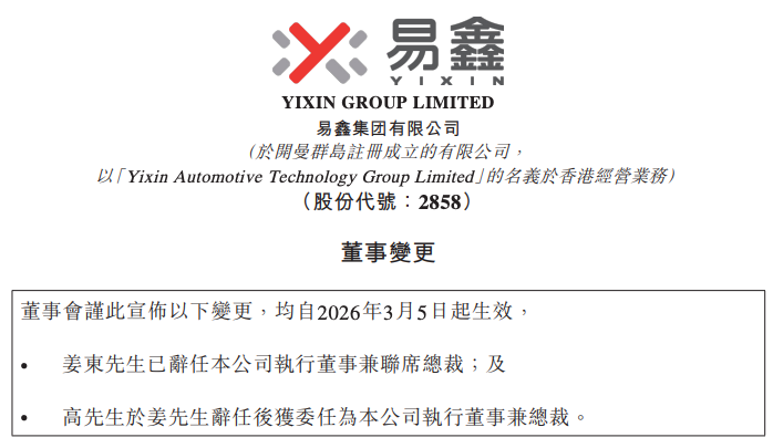 【TechWeb】3 月 6 日消息,易鑫集团有限公司 (股份代号:2858) 公布截至 2025 年 12 月 31 日止年度经审计业绩,同日,宣布姜东先生辞任执行董事兼首席总裁,由高翊先生接任执行董事兼总裁,自 2026 年 3 月 5 日起生效。