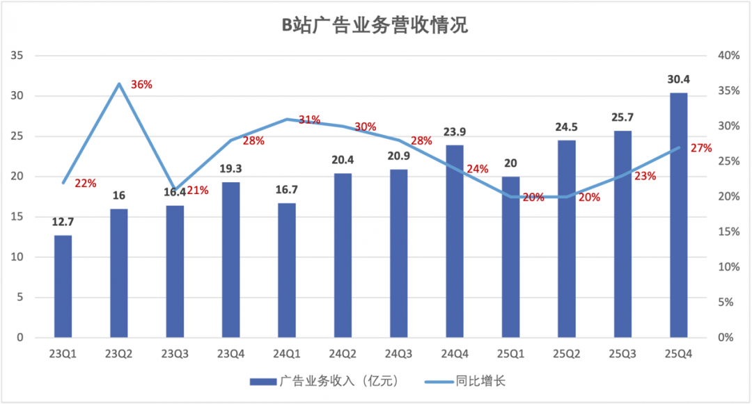 广告则是最大增长引擎,2025 年全年收入 100.6 亿元,同比增长 23%,占总营收比重升至 33%。
