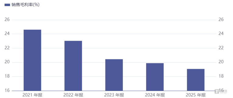 比增速放缓更严峻的,是公司综合毛利率的“ 四连跌”,从 2021 年的 24.60%,一路滑落至 2025 年的 19.07%,四年间跌去 5.53 个百分点。其中,被视为未来核心增长引擎的智能驾驶板块,毛利率降幅尤为刺眼,同比下滑 3.55 个百分点至 16.36%,成为拖累整体盈利水平的主因。