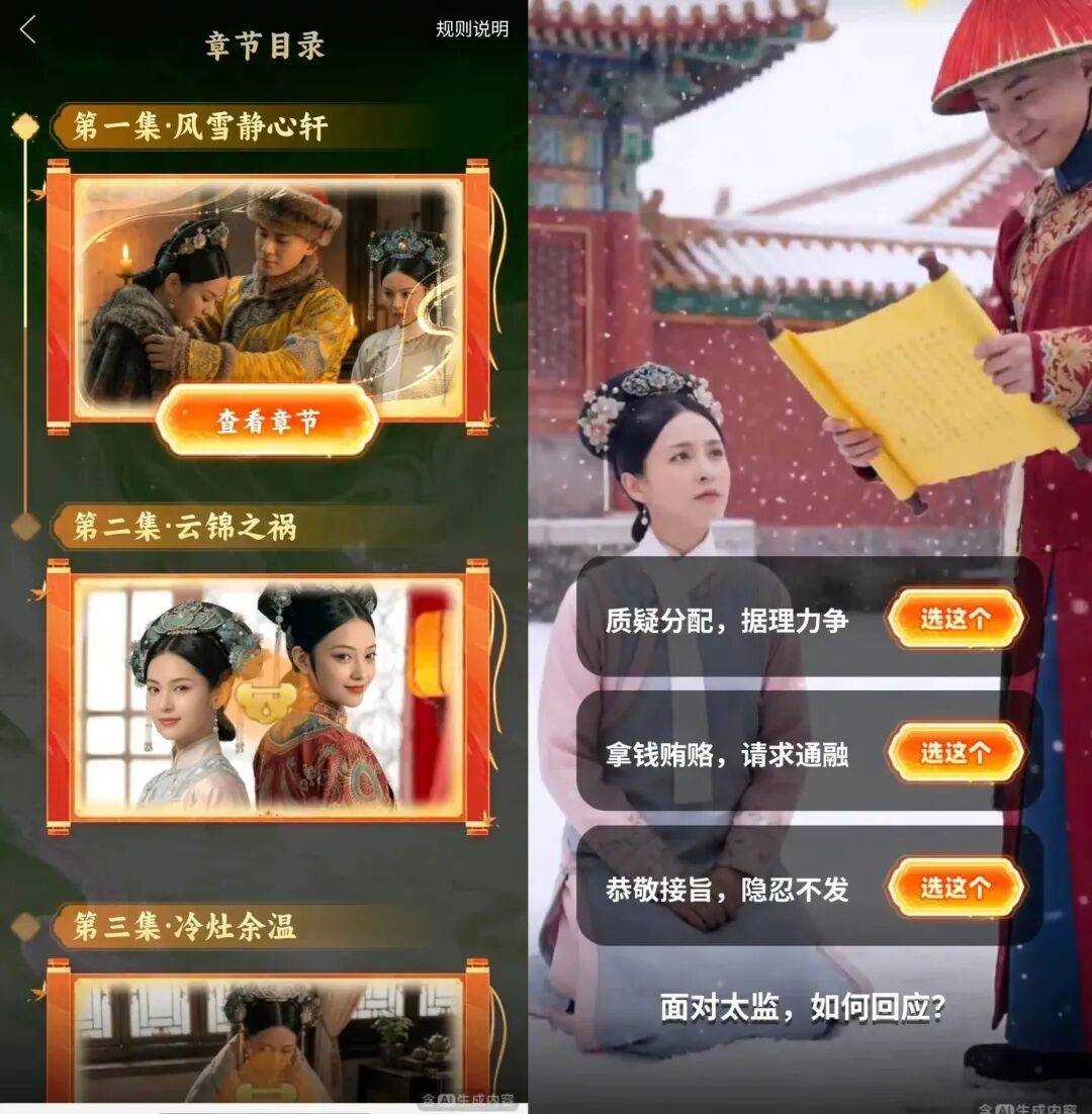 无独有偶,自媒体“ 读佳” 透露,拼多多也在测试 AI 互动剧情新玩法,目前已上线 《重生归来,我把后宫嫔妃踩脚下》 等互动式内容。