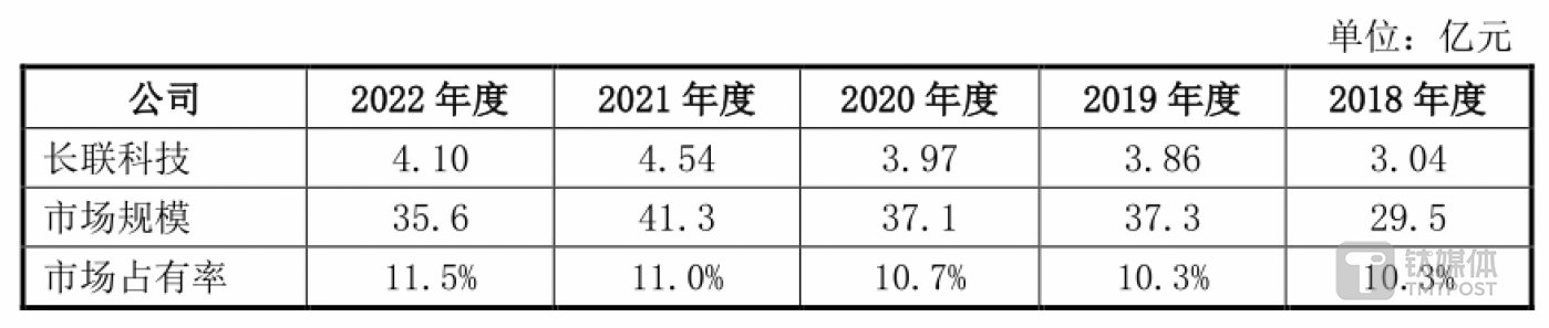 这些创新的成果的不断反哺,也支撑长联科技牢牢占据行业第一的市场地位。根据沙利文统计数据发行人国内市场占有率从 2018 年的 10.3% 上升至 2022 年的 11.5%,2020 年和 2022 年均排名第一,市场占有率呈上升趋势。