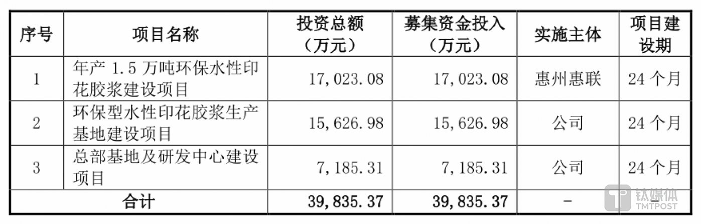 正是看到了行业的增长空间,所以长联科技选择当下扩大产量。此次募资主要将上马 「年产 1.5 万吨环保水性印花胶浆建设项目 「」 环保型水性印花胶浆生产基地建设项目」 两个项目。