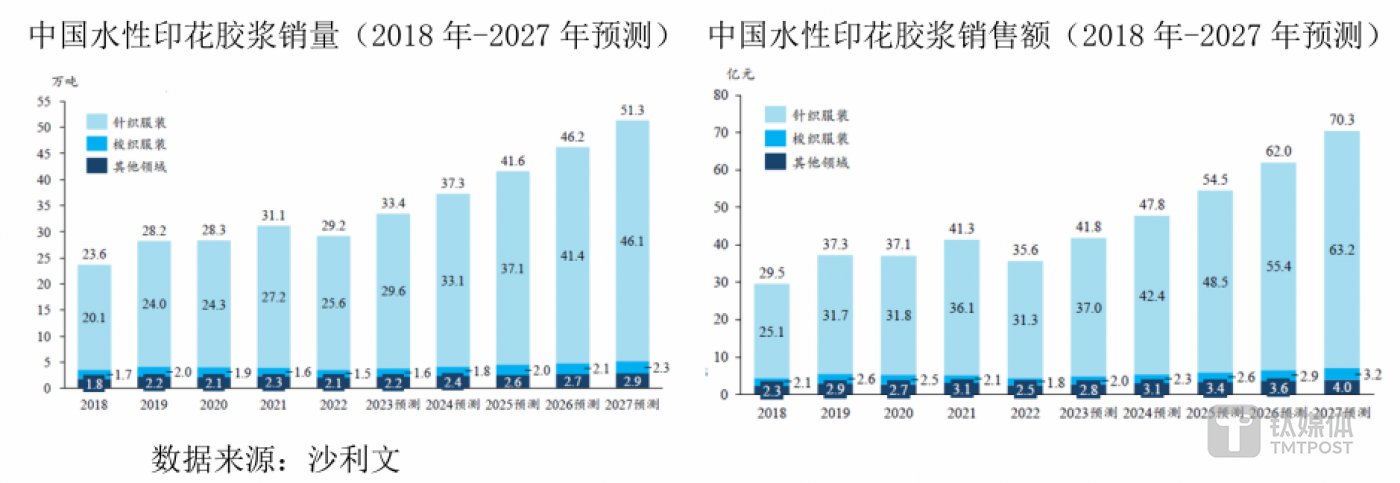 有了下游行业的市场做支撑,水性印花胶浆的市场前景也被看好。根据沙利文统计数据,预计全球及中国水性印花胶浆销售额将在 2023 年到 2027 年期间持续增长,预计 2027 年全球水性印花胶浆销售额将达到 162.4 亿元,中国水性印花胶浆销售额将达到 70.3 亿元。
