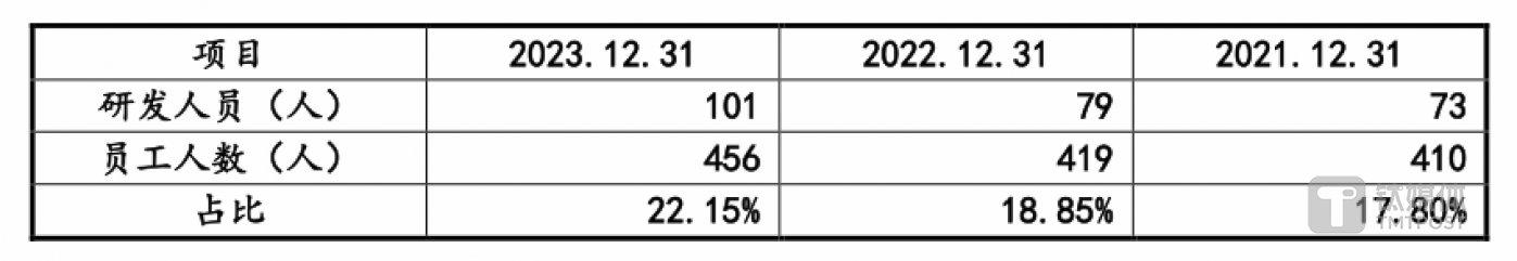 招股书披露的数据显示,公司在 2021 年~2023 年的研发费用支出分别为 2371 万元、2554 万元和 2682 万元,最近三年累计研发投入金额为 7608 万元。这期间,公司研发人员数量和员工占比也在逐年增加。截至 2023 年 12 月 31 日,公司研发人员共有 101 人,占员工总数的 22.15%。