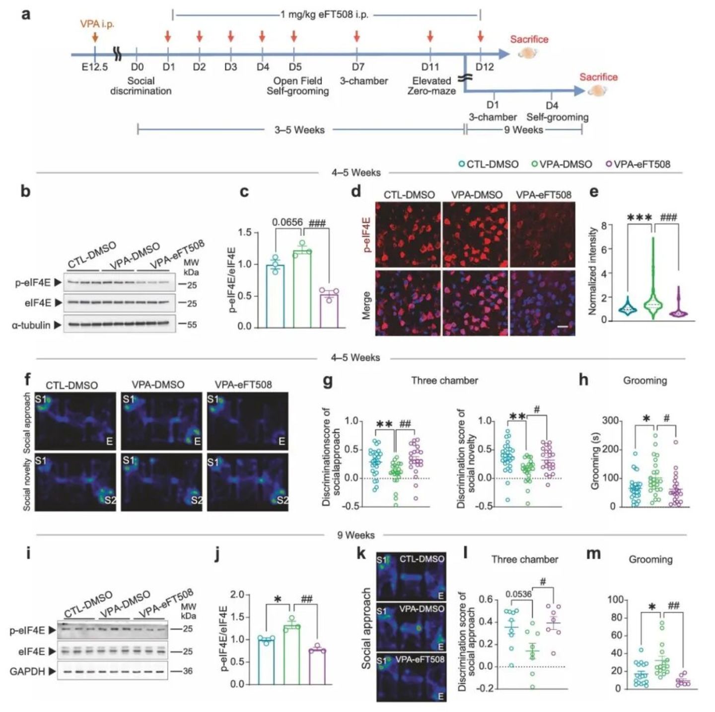 eFT508 是可透过血脑屏障的 MNK1/2 抑制剂,已有研究表明它能改善自闭症模型小鼠的行为缺陷。作者先证实,给幼龄小鼠腹腔注射 eFT508 1 小时后,可明显抑制皮层 eIF4E Ser209 位点的磷酸化且不影响小鼠自主活动,无明显行为副作用。给药前作者先通过社交实验确认 VPA 模型构建成功,随后在小鼠 3–4 周龄连续 4 天注射 eFT508,并在每次行为测试前 1 小时补打一针。