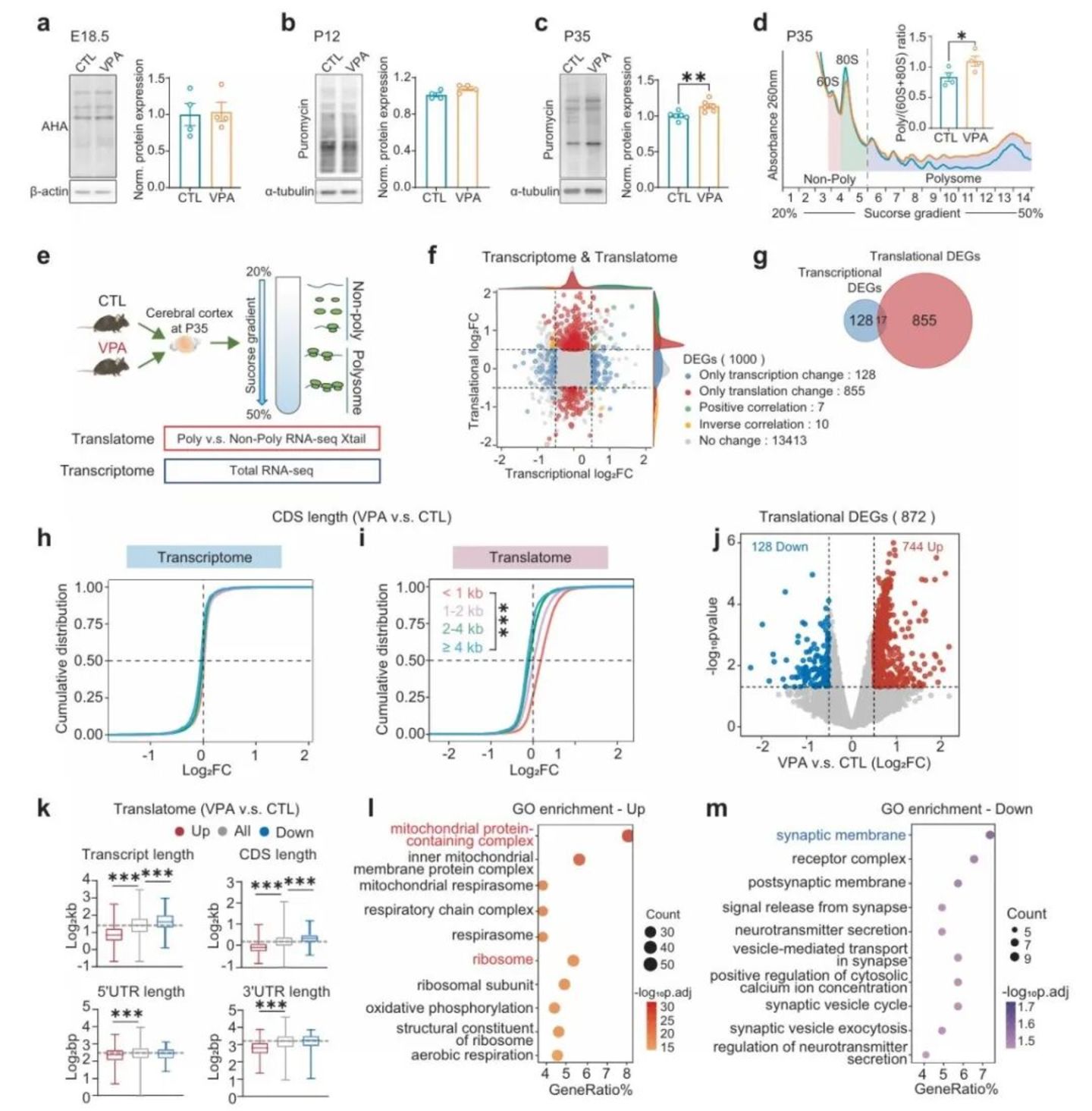 进一步分析显示,VPA 主要影响基因的翻译过程 (而非转录),且对不同长度的基因 mRNA 影响不同:短 mRNA 更易被翻译 (多是线粒体、核糖体相关基因),长 mRNA 更难被翻译 (多是突触相关基因),最终导致大脑翻译组失衡,影响大脑功能。