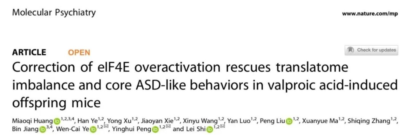 基于此,2026 年 3 月 7 日,暨南大学师蕾、彭颖慧、叶文才研究团队在 《Molecular Psychiatry》 杂志发表了 「Correction of eIF4E overactivation rescues translatome imbalance and core ASD-like behaviors in valproic acid-induced offspring mice」, 揭示了校正 eIF4E 过度激活可挽救丙戊酸诱导子代小鼠的翻译组失衡及核心孤独症样行为。