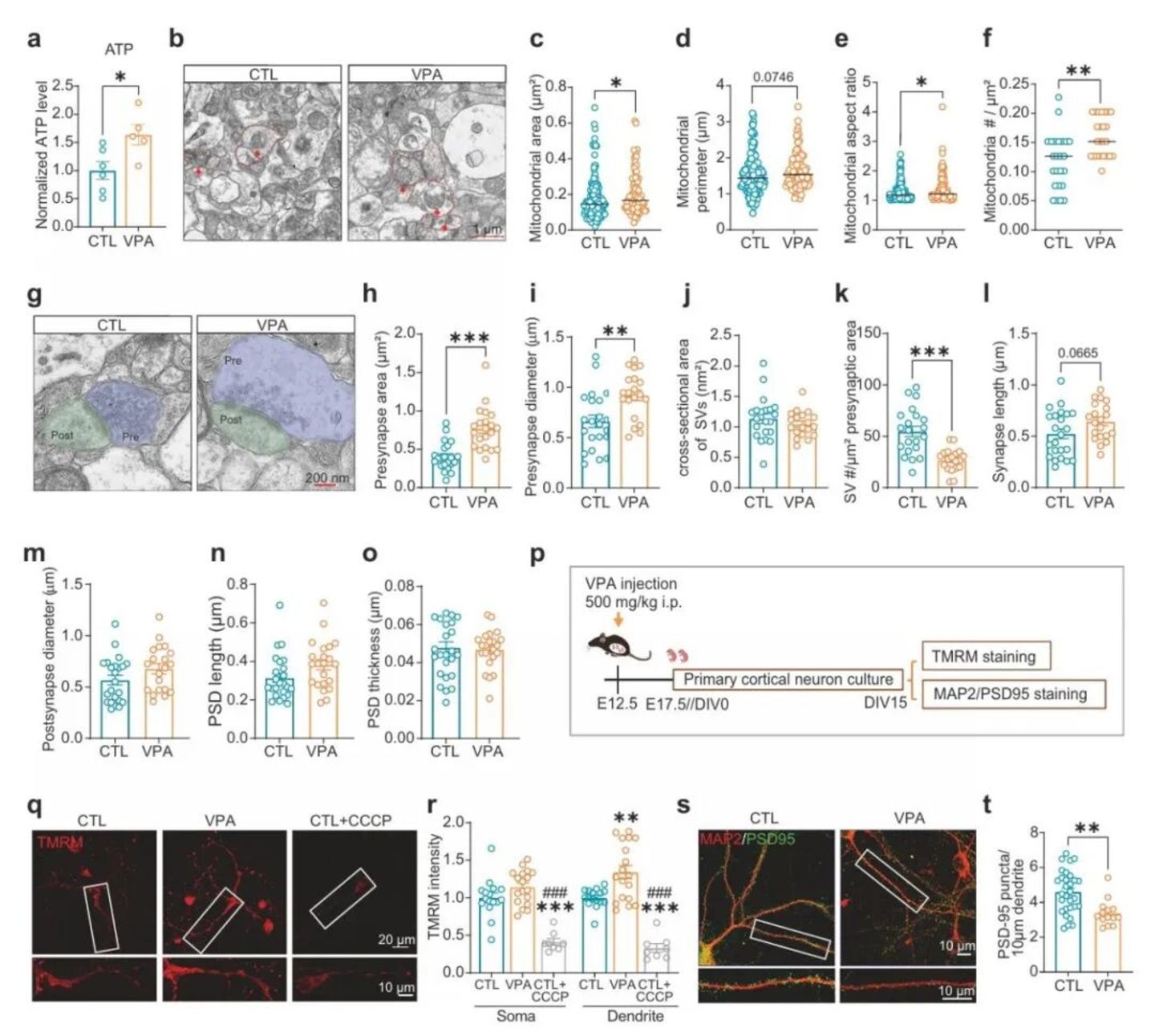 由于 VPA 暴露小鼠皮层的翻译组和突触蛋白组都出现线粒体复合物及氧化磷酸化相关蛋白上调,作者进一步观察了线粒体形态与功能变化。