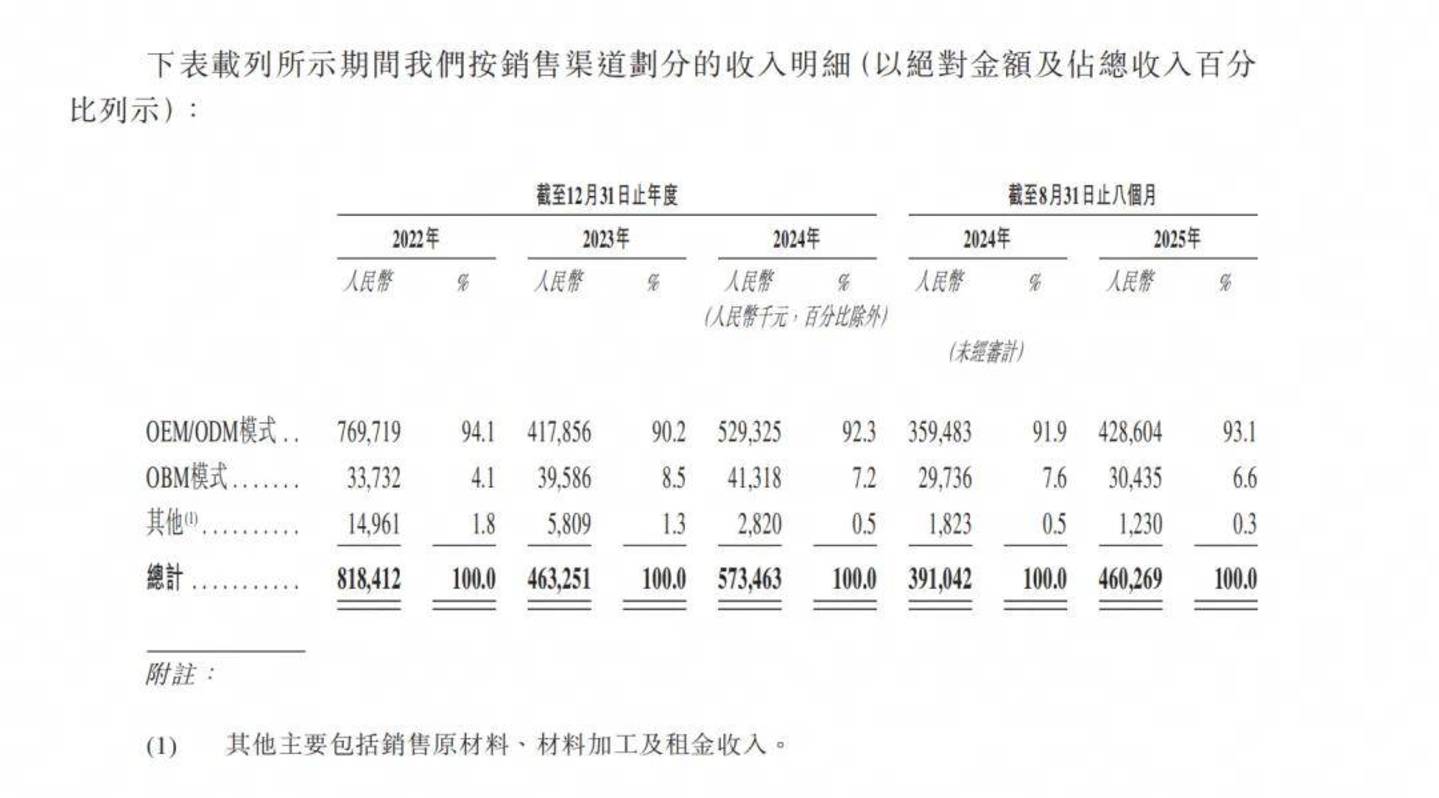 招股书显示,报告期内 (2022 年、2023 年、2024 年和 2025 年前 8 个月),乐欣户外 OEM(原始设备制造)/ODM(原始设计制造) 模式的收入占比始终维持在 90% 以上,最高时达到 94.1%。