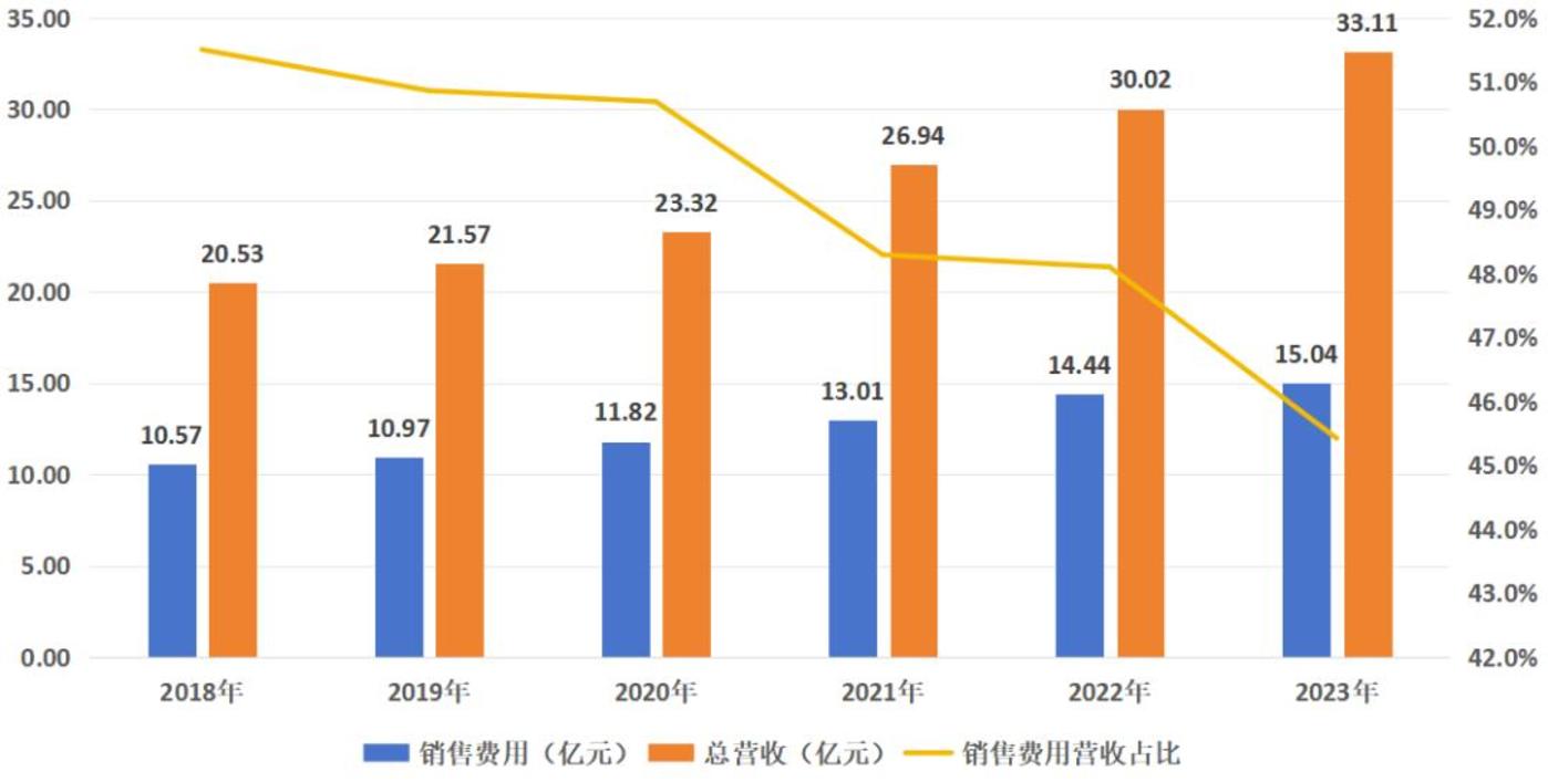 不过,虽然膏药市场需求一直存在,但是整体市场规模并不大、增长空间有限,随着竞争者的增加,蛋糕自然也就越分越小。为了保证自身在激烈竞争中的领先身位,羚锐制药的销售费用常年保持在 10 亿元以上,2023 年达到 15.04 亿元,同期研发费用仅为 1.1 亿元。虽然销售费用在总营收中的占比持续下降,但比例的绝对值也在 45% 之上。