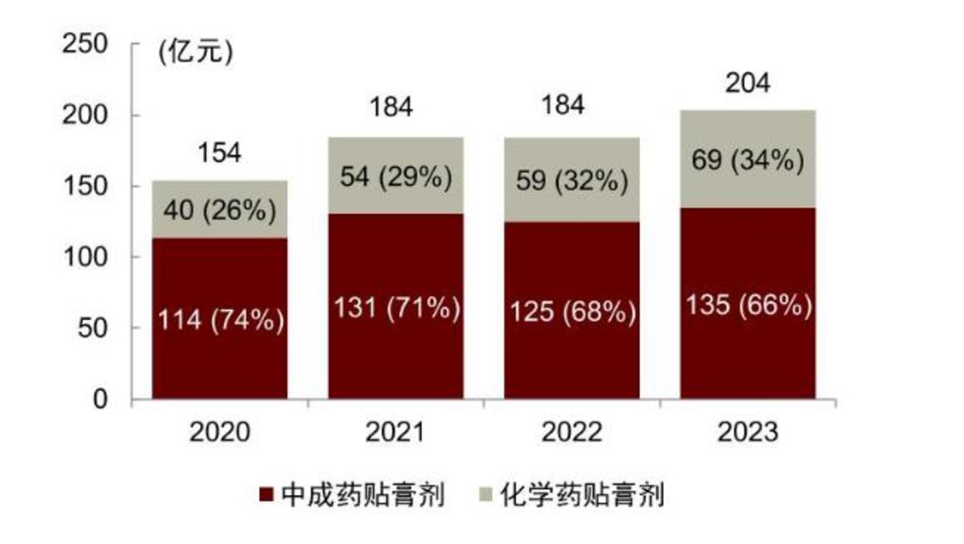 根据中金公司数据,2023 年我国药用贴膏剂行业市场规模约为 204 亿元,其中中成药贴膏市场规模为 135 亿元,占比总市场比例的 66%;化药贴膏剂占比逐年增长,由 2020 年的 26% 提升至 2023 年的 34%。