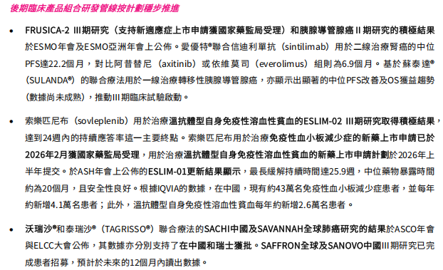 目前,和黄医药多款自研产品迎来密集进展:索乐匹尼布用于治疗免疫性血小板减少症的新药上市申请已在 2026 年 2 月获国家药监局受理,用于温抗体型自身免疫性溶血性贫血的上市申请计划于 2026 年上半年提交;呋喹替尼联合信迪利单抗治疗肾癌的Ⅱ期研究显示中位 PFS 达 22.2 个月,显著优于对照组。