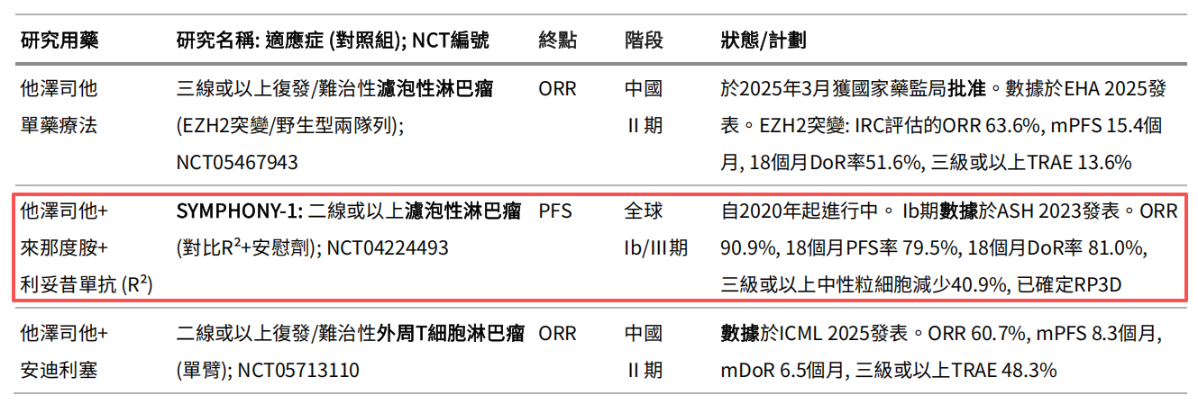 但隐患早已埋下。附条件批准的核心要求是,企业需在获批后继续开展确证性临床试验,以验证产品的长期安全性和有效性。他泽司他的全球确证性研究 SYMPHONY-1(Ib/III 期) 由益普生主导,旨在评估其联合来那度胺和利妥昔单抗 (R² 方案) 对比单纯 R² 方案治疗滤泡性淋巴瘤的疗效。