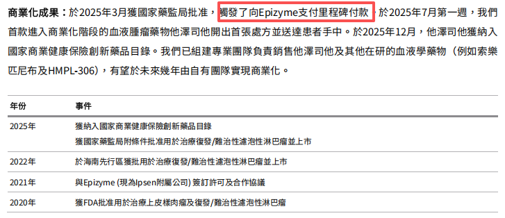 除首付款外,和黄医药在年报中明确提及,“2025 年 3 月他泽司他获国家药监局附条件批准,触发了向 Epizyme 支付里程碑付款”,具体金额未公开。