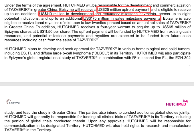 2021 年引进该产品时,和黄医药已支付 2500 万美元首付款。协议中还约定了最高 1.1 亿美元的研发及监管里程碑款项,覆盖最多 8 个潜在适应症的推进节点,以及最高 1.75 亿美元的销售里程碑付款;此外还有为期四年的认股权证,可按 11.5 美元/股的价格收购 Epizyme 价值 6500 万美元的股份。