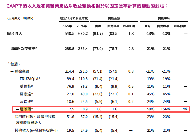 年报数据显示,2025 年他泽司他在中国市场的销售额仅为 250 万美元,占公司全年 5.485 亿美元营收的比例不足 0.5%。和黄医药也在公告中表示,此次撤市预计不会影响公司的财务指引。