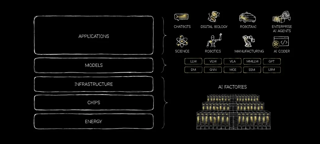 黄仁勋的核心洞察是:计算的本质已发生根本逆转。过去几十年,软件是“ 预制” 的—— 人类写代码,计算机执行检索。如今 AI 是“ 实时生成智能”,能理解、推理、并根据情境动态回应。这意味着整个计算栈必须被重构。由此,他提出了“ 五层蛋糕” 产业模型:能源→ 芯片→ 基础设施 (AI 工厂)→ 模型→ 应用。