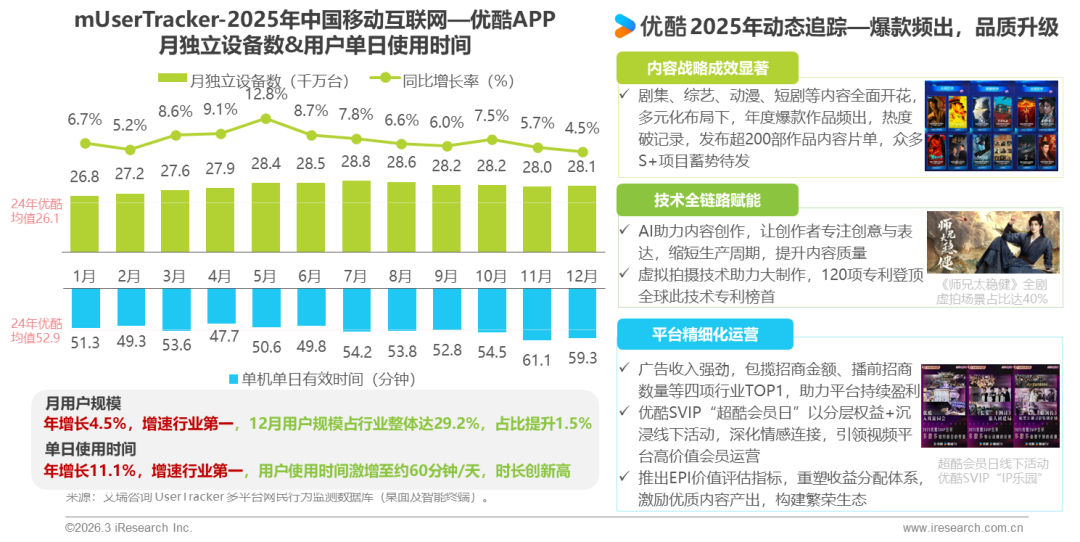 根据报告,截至 2025 年 12 月,优酷用户规模占行业整体 29.2%,占比提升 1.5%,但未披露具体用户数;用户单日使用时间至 60 分钟,创历史新高。