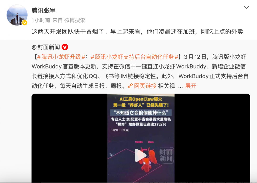 腾讯版小龙虾升级 张军:开发团队快干冒烟了 凌晨还在加班
