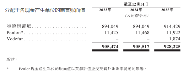 首当其冲的是高企的商誉风险,截至 2025 年底,公司因收购因收购英国 Penlon、江苏唯德康医疗、Vedefar 等企业形成的商誉高达 9.28 亿元,占同期净资产 18.76 亿元的 49.47%,近乎半壁江山。其中,仅收购唯德康医疗一项就形成 9.14 亿元商誉,成为商誉总额的绝对主力。
