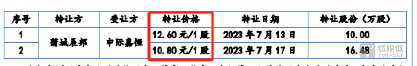 其中,蒲城辰邦转让科隆新材的股权价格出现了两个价格,分别为 12.6 元/股、10.8 元/股,价格相差较大,并且受让方均为中际嘉恒。仅仅相差 4 天时间,科隆新材每股就少了近 2 元。