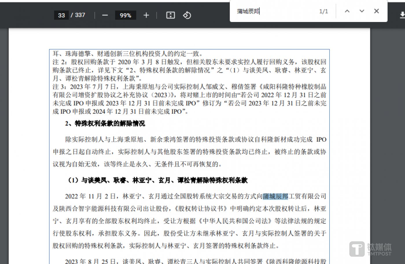 令人意想不到的是,周天财经 APP 在科隆新材的首份申报稿 (即 2023 年 10 月 31 日) 中搜索关键字中际嘉恒,搜索结果为未找到任何相关信息,并且在搜索关键字蒲城辰邦,仅在对赌协议中发现相关信息。这也意味着,2023 年 7 月,科隆新材的股权转让事件,公司未披露。如此信披质量是否涉嫌信披违规?