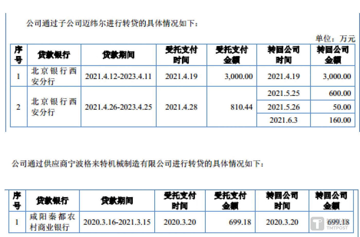 周天财经 APP 注意到,科隆新材的内控也存在着颇多 「漏洞」。报告期内,科隆新材存在为满足贷款银行受托支付要求,将取得的贷款资金以采购货款名义支付给全资子公司迈纬尔、供应商宁波格来特机械制造有限公司,再由其将资金转回公司的不规范使用银行贷款行为,具体情况如下: