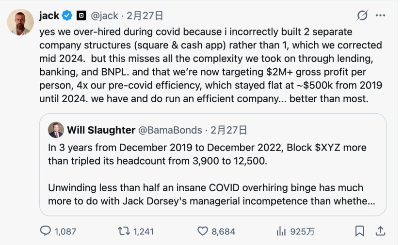面对质疑,Dorsey 在 X 平台松了口,承认疫情期间错误拆分公司架构,导致人员严重冗余。