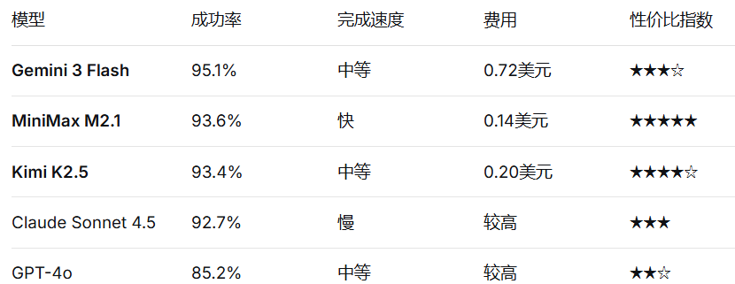 评测中MaxClaw之所以能唯一“ 一次性成功”,是因为它背后是MiniMax M2.1—— 成功率93.6%、速度冠军、性价比之王。而KimiClaw表现“ 拉胯”,虽然用了自家K2.5模型 (成功率93.4%不低),但实测中暴露的问题是云端服务的稳定性,而非模型能力本身。