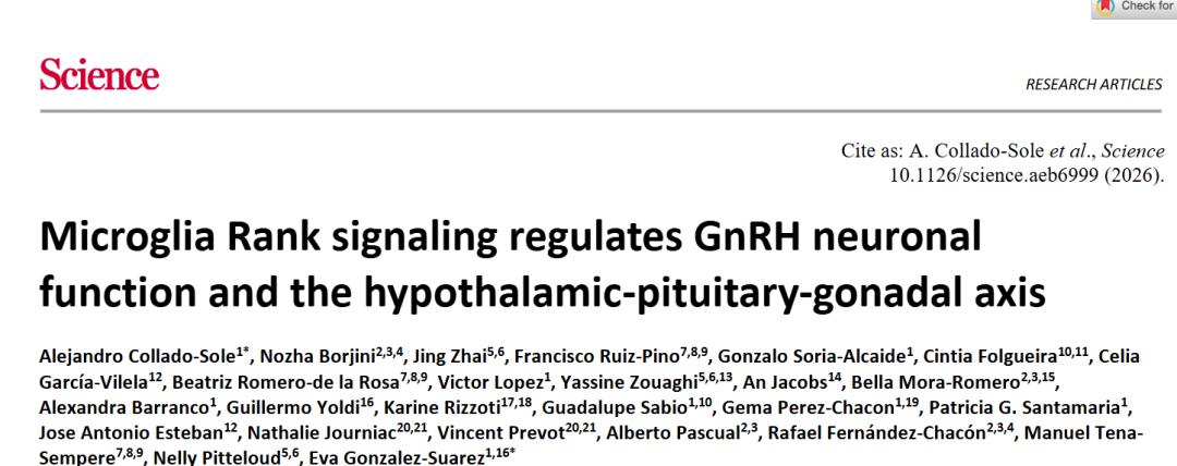 本标题为《Microglia Rank signaling regulates GnRH neuronal function and the hypothalamic-pituitary-gonadal axis》,研究发现下丘脑小胶质细胞的 Rank 信号是调控促性腺激素释放激素(GnRH) 神经元功能和下丘脑 - 垂体 - 性腺 (HPG) 轴的核心,证实小胶质细胞通过 Rank 信号调控生殖成熟和生育能力。