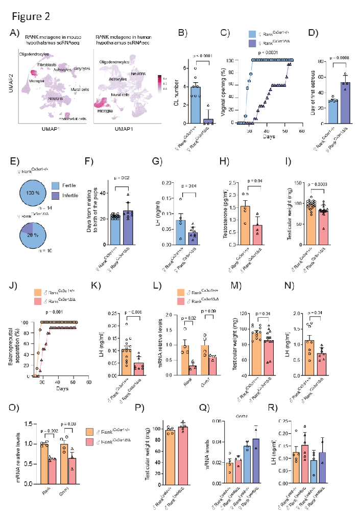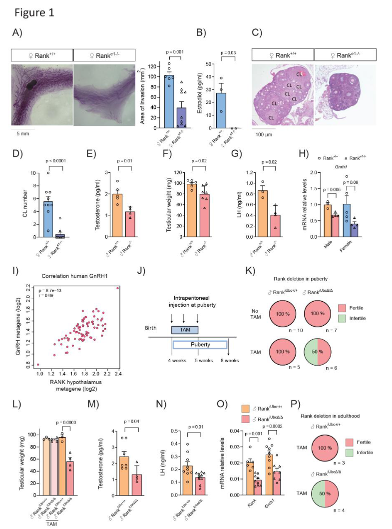 研究者好奇一个叫Rank 的基因。结果发现,全身敲除 Rank 的小鼠,出现了一连串问题:雌鼠雌激素不足、不排卵、雄鼠睾酮降低、生精小管萎缩、无论雌雄,都不育。更关键的是,垂体分泌的促性腺激素减少,下丘脑的 GnRH1(促性腺激素释放激素) 表达也下降了。这不只是生殖器官坏了,是整个下丘脑-垂体-性腺轴失灵了。