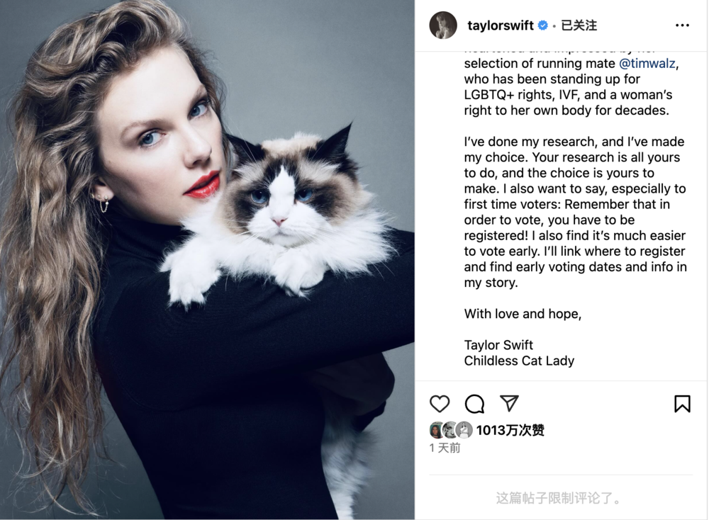 最点睛的是泰勒·斯威夫特的配图,是一张怀抱猫咪的照片,并且在声明的结尾落款处,将自己称作 「childless cat lady」。