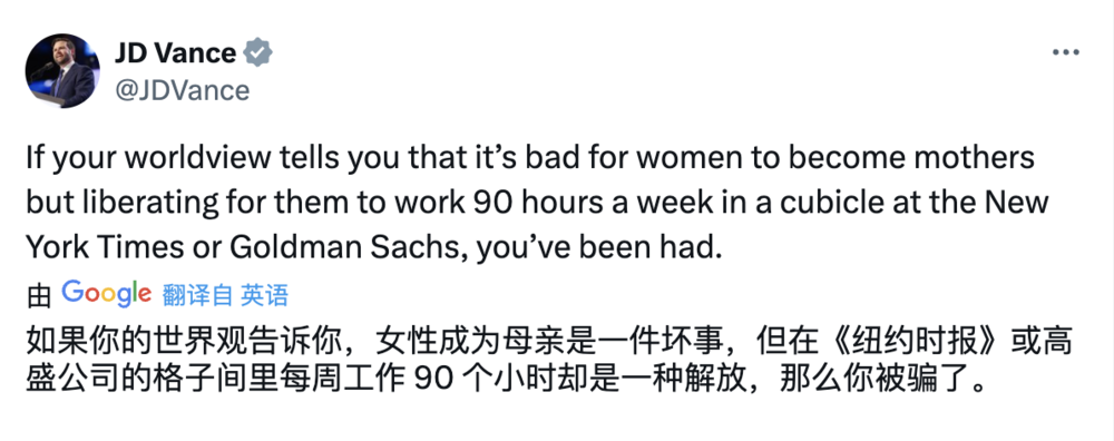 「如果你的世界观告诉你,女性成为母亲是一件坏事,但在 《纽约时报》 或高盛的格子间里每周工作 90 个小时却是一种自由解放,那你就被骗了。」