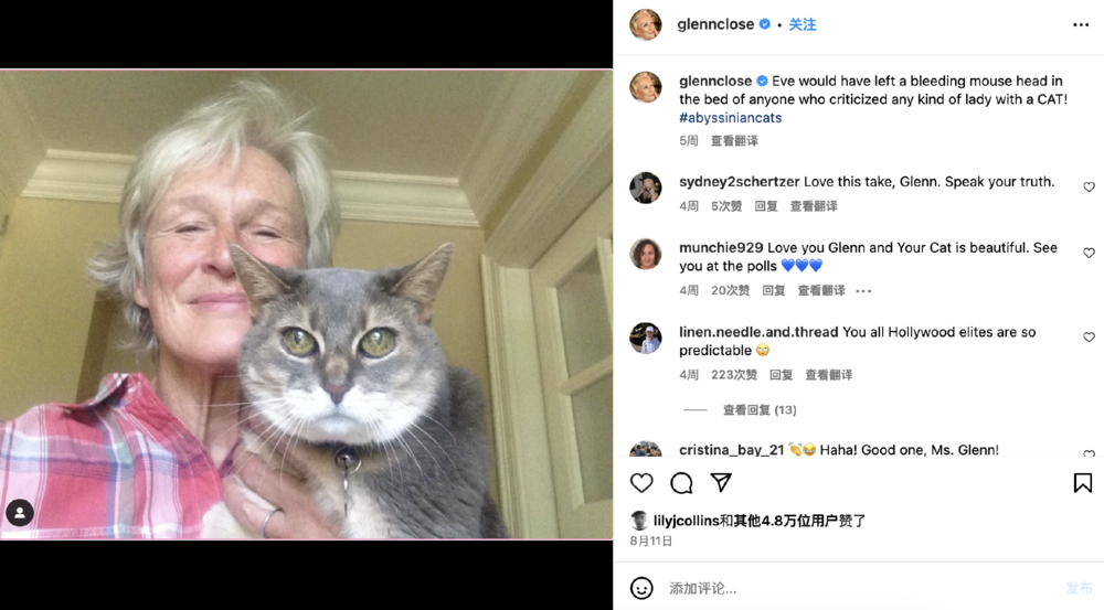 更戏剧化的,是饰演万斯外婆的演员格伦·克洛斯,如今也讽刺万斯的 「猫女言论」。老太太在自己的 ins 上发布了一张抱着猫的照片,并配文:「如果有人批评养猫的女士,夏娃就会在他的床上留下一个流血的老鼠头!」