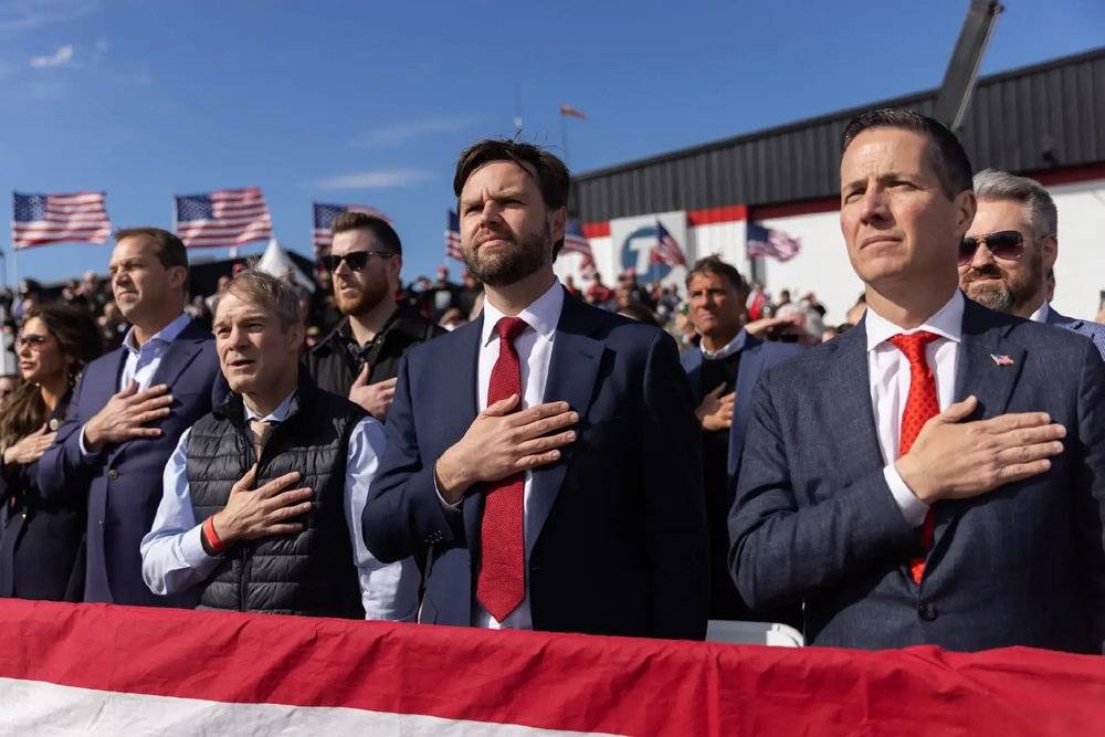 他站在讲台上,身穿与特朗普相同的深蓝色西装,打着相同的红色领带,拉满火力攻击拜登,攻击哈里斯,攻击把美国的工作机会送给中国,把美国军队送到乌克兰的自由派精英;攻击那些让通货膨胀破坏经济,那些让移民涌入祖国母亲腹地的民主党人。