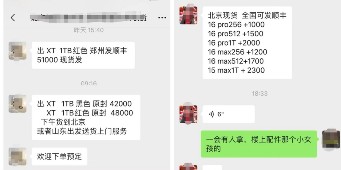 作为资深黄牛,早在 9 月 19 日,张奇就给顾客提供低于官网价的 iPhone 16,「压价 100~200 元,9 月 20 日顺丰到付。」 同时,9 月 19 日张奇就能给顾客送货上门,「iPhone 16 Pro 256G 加价 1000,最高的 16 Pro 1T 加价 2000 元。」