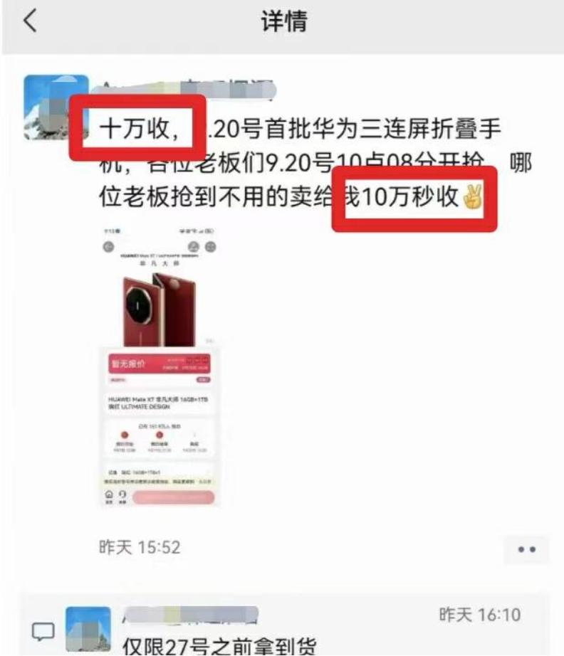 「抢到一台华为三折叠,这个月可以躺平了。」9 月 10 日,预约到华为三折叠的某大三学生告诉字母榜,随即就有黄牛加价 2 万元收走。