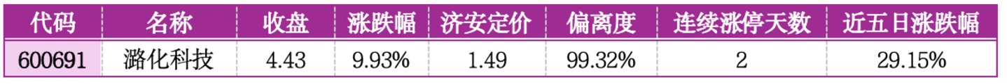 个股层面,万和电气、健盛集团、奥美医疗较济安定价分别低估 86.72%、69.28%、68.68%,估值折价显著,叠加所属板块景气度回升及产业政策支撑,具备稳健的估值修复机会;而郑州煤电、潞化科技、法尔胜偏离度分别达 120.11%、99.32%、96.52%,估值存在严重溢价,且均为 2 连板,短期涨幅透支题材预期,投机风险较高。