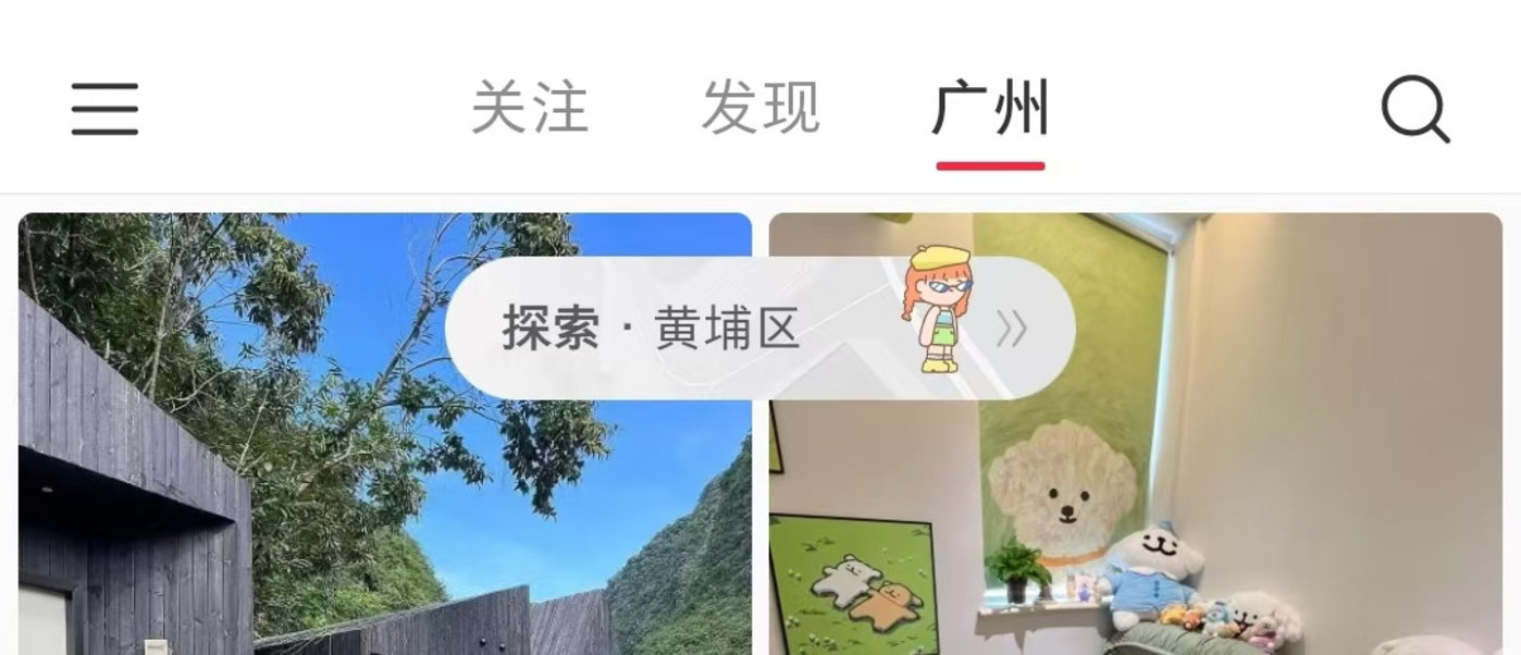 用户在 APP 上方的导航栏点击定位城市,在页面上方就会显示一个气泡型入口 「探索·××区」,点击后就能看见自己所在定位的地图和周边的商家。