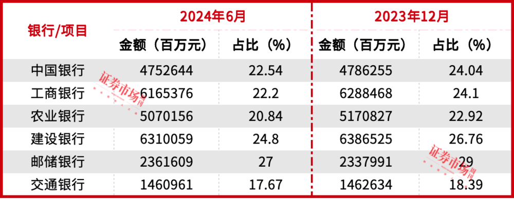 与此同时,大多数国有行个人住房贷款余额在全部贷款中的占比也处于下滑状态,2024 年上半年六家国有行的个人住房贷款在全部贷款及垫款余额中的占比平均值为 22.5%,低于 2023 年底 24.2%(见表 2)。六家国有银行的个人住房贷款占比全部下滑,无一例外。