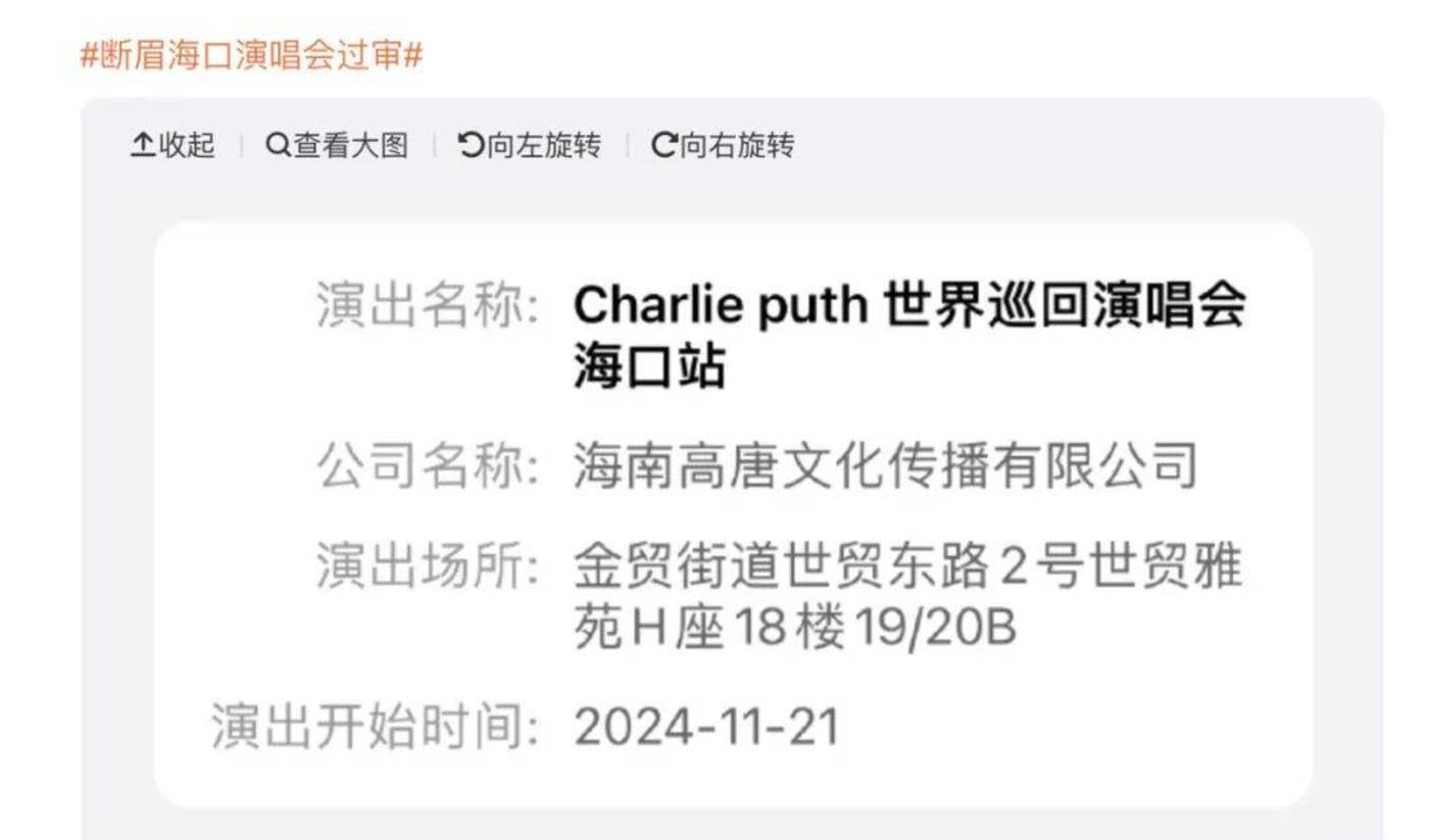 见识了侃爷这波操作,想必眼红中国市场的国际歌手都在摩拳擦掌了。所以就在这两天,微博开始网传 #断眉海口演唱会过审 # 的热搜消息,据流出的承办商截图显示,断眉将于 11 月 21 日开唱的海口站巡演已经过审,截图还同时透露了 11 月 28 日的断眉广州演唱会。
